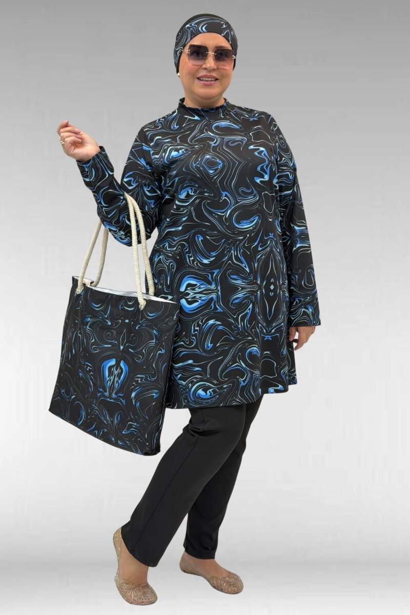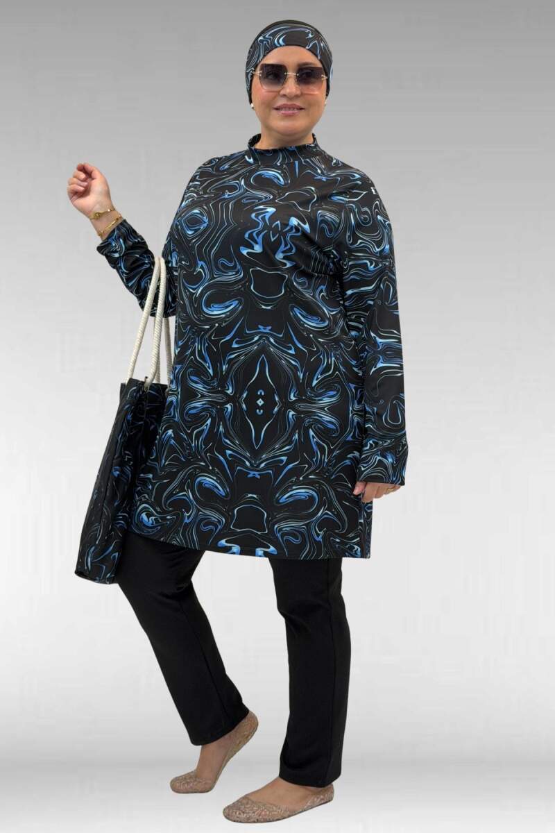 1727 Büyük Beden Uzunkol Tesettür Mayo Takım - Aqua Mavi-Siyah