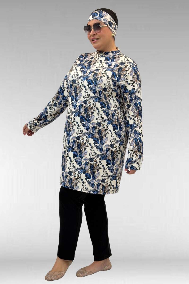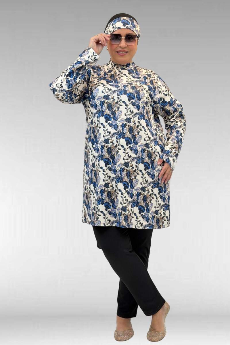 1727 Büyük Beden Uzunkol Tesettür Mayo Takım - Yaprak Desen Mavi-Siyah
