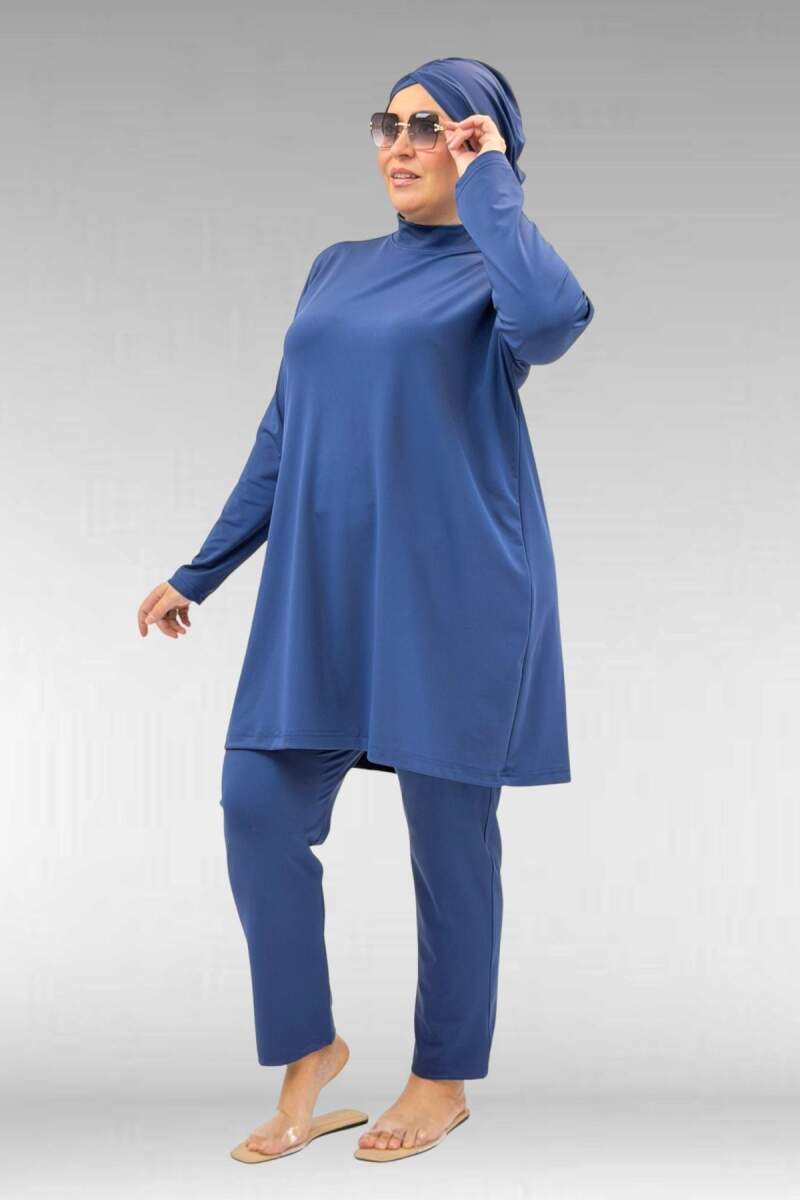 1740 Büyük Beden Düz Renk Tesettür Mayo - İndigo