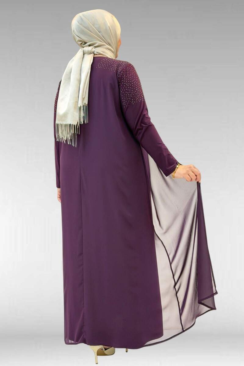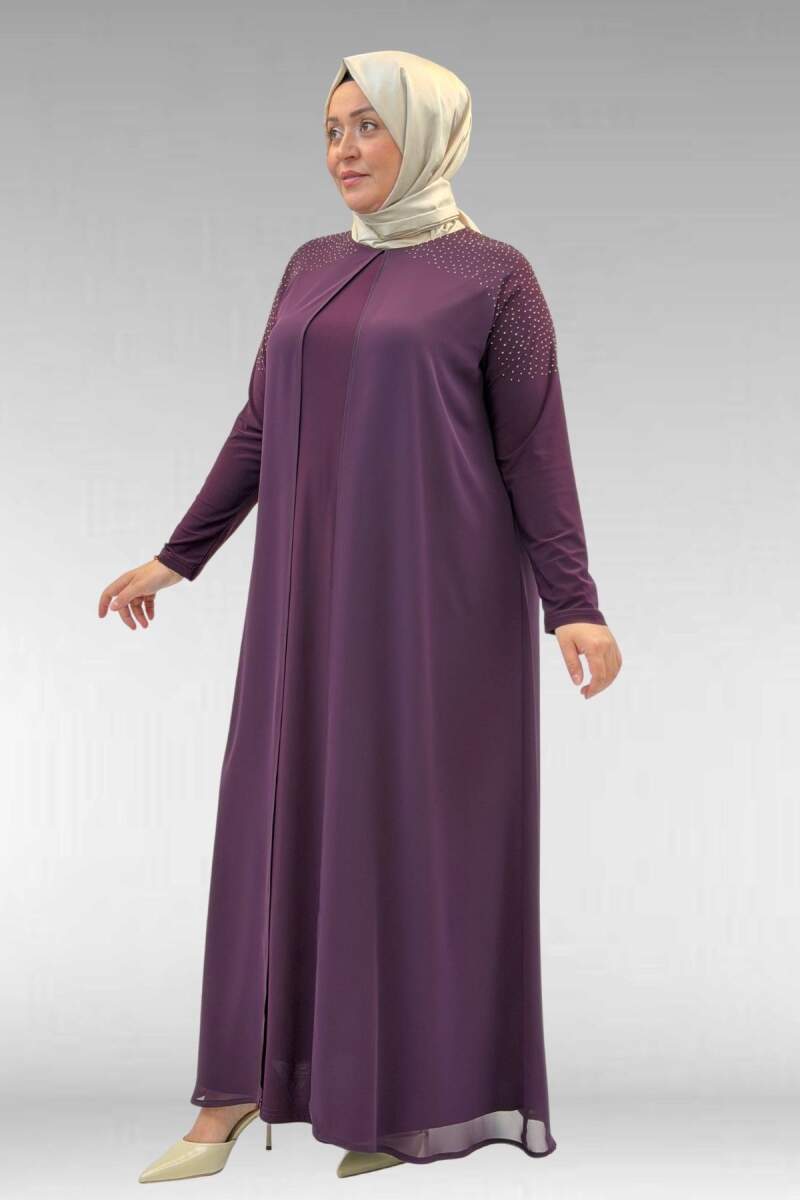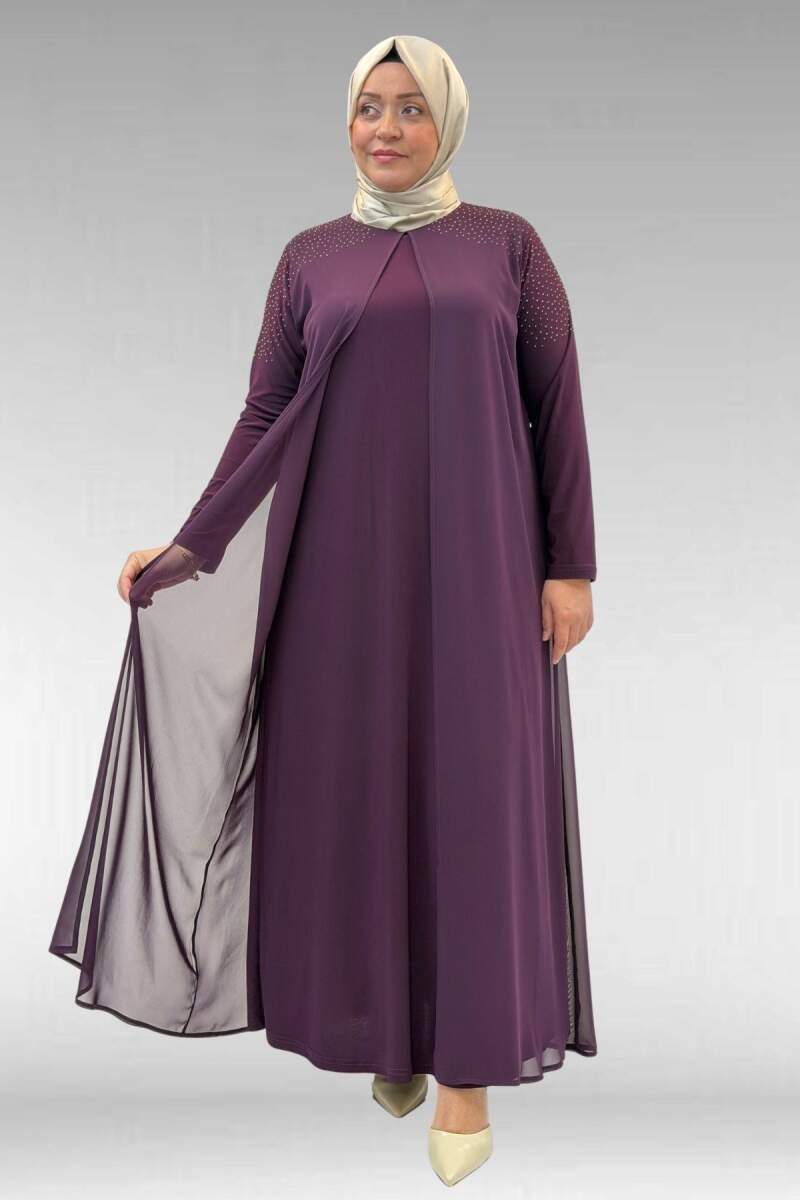 42003 Büyük Beden Taş Detaylı Sandy-Şifon Elbise - Mürdüm
