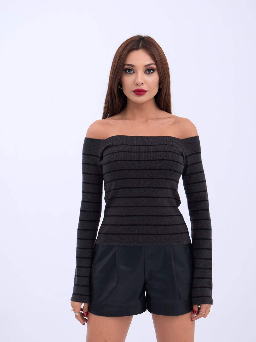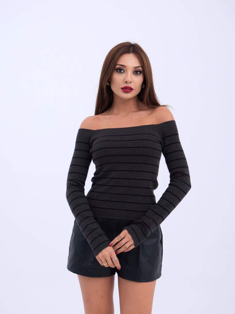 4206 TRİKO ÇİZGİLİ KAYIK YAKA CROP-ANTRASİT-SİYAH
