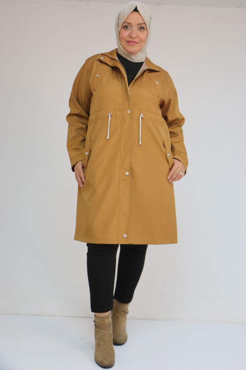 43054 Büyük Beden Belden Bağlamalı Çizgili Bondit Trençkot - Taba