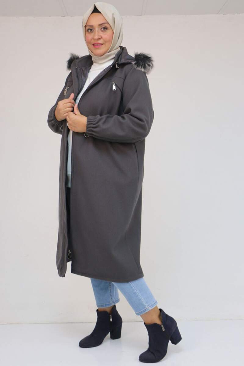 43087 Büyük Beden Kolları Lastikli Kapşonlu Kaşe Kaban - Antrasit