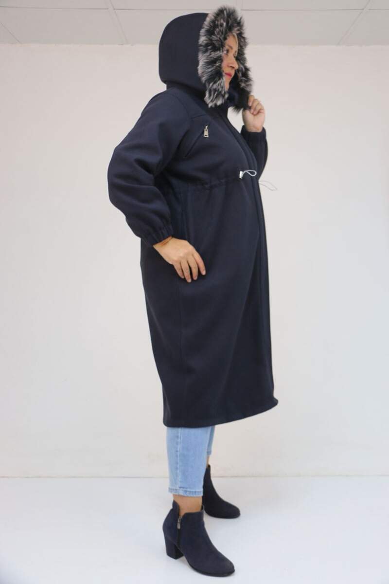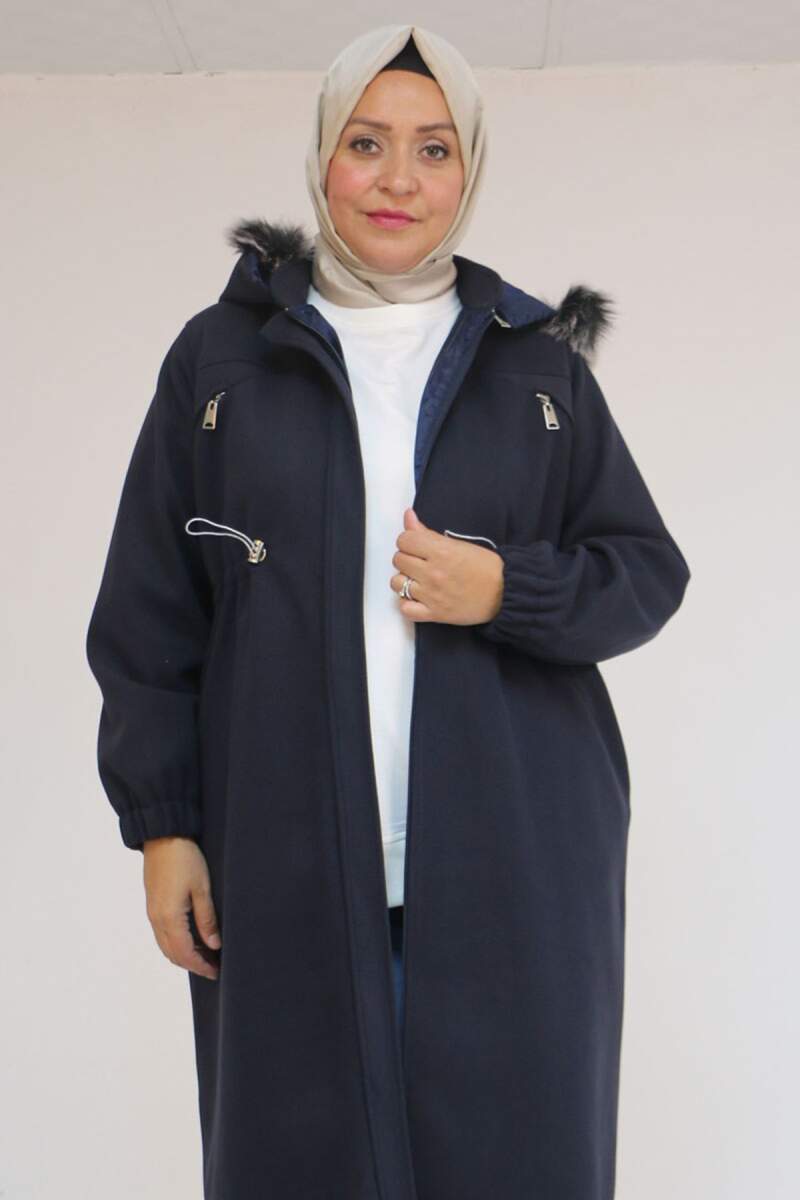 43087 Büyük Beden Kolları Lastikli Kapşonlu Kaşe Kaban - Lacivert
