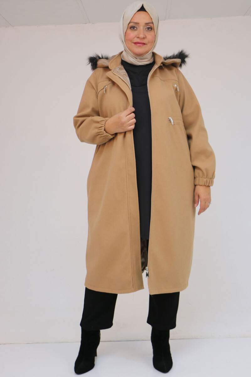 43087 Büyük Beden Kolları Lastikli Kapşonlu Kaşe Kaban - Taba