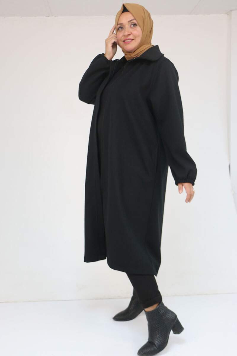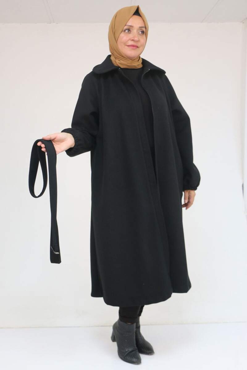 43090 Büyük Beden Yakalı -Kuşaklı Kolu Lastikli Kaşe Kaban - Siyah