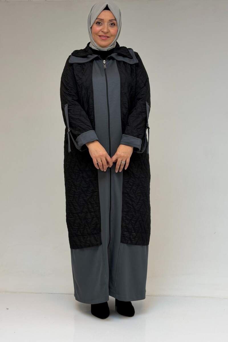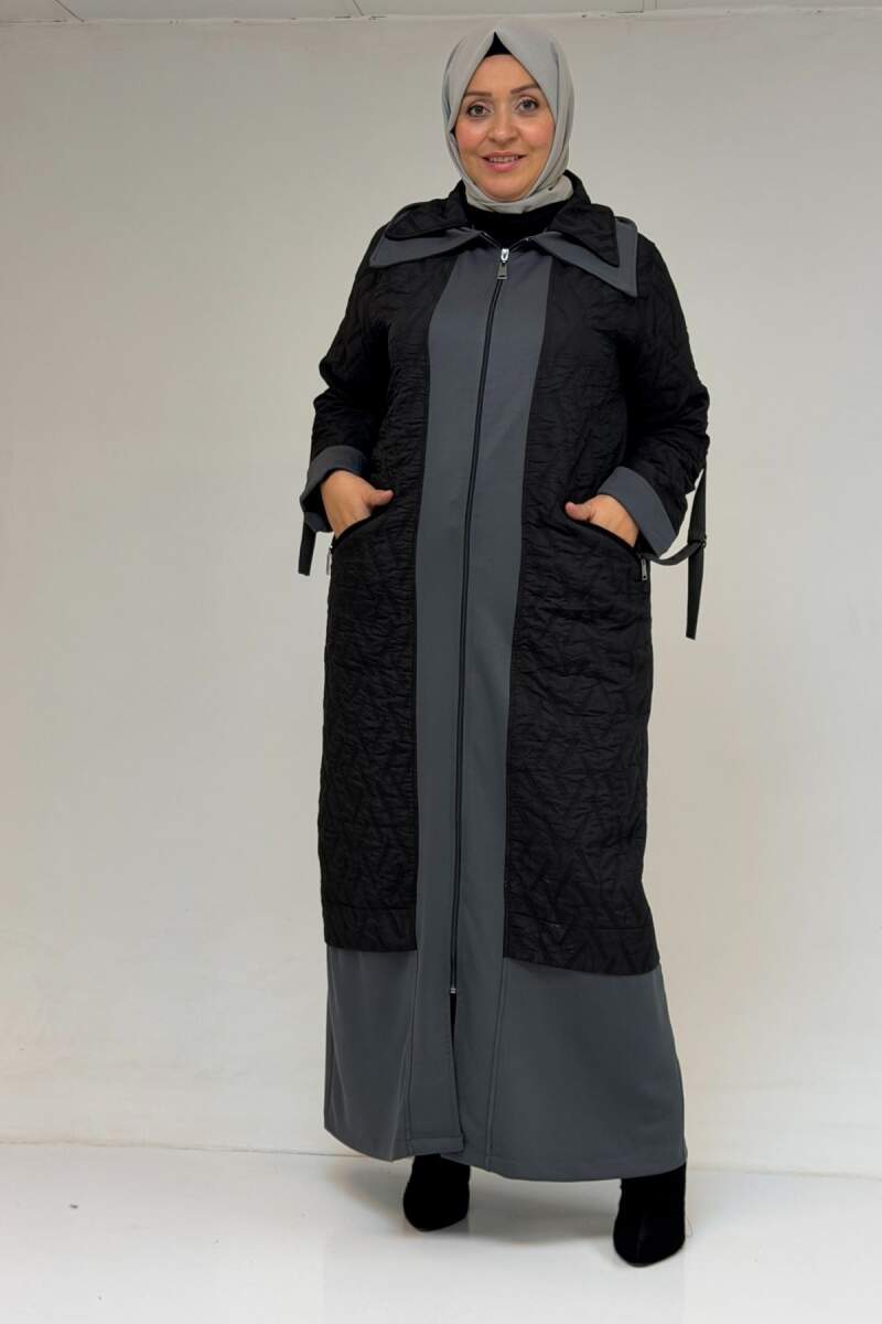 46018 Büyük Beden Fermuar Cepli Modal-Kapitone Kaban - Siyah-Antrasit