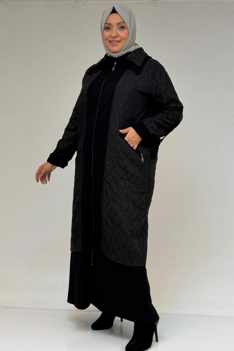 46018 Büyük Beden Fermuar Cepli Modal-Kapitone Kaban - Siyah-Siyah