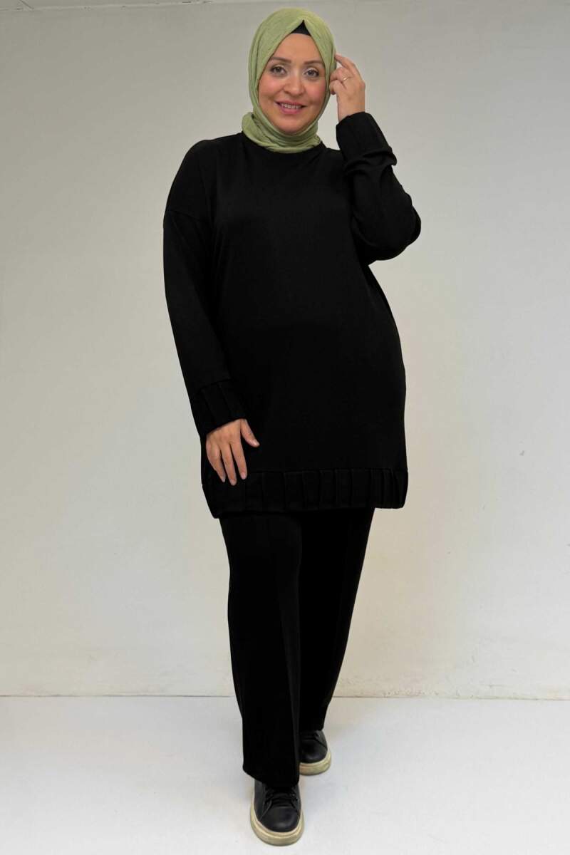 47069 Büyük Beden Çıma Detaylı Modal Pantolonlu Takım - Siyah