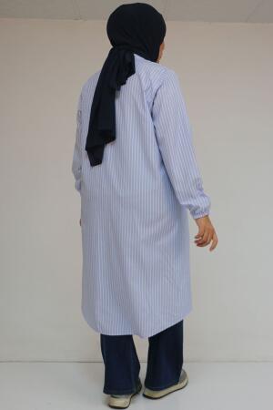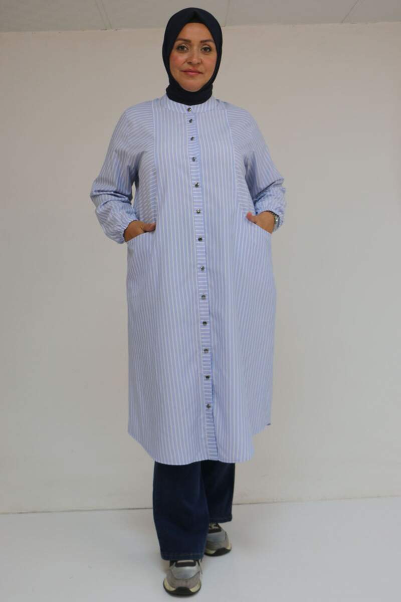 48072-1 Büyük Beden Kolları Lastikli Tunik - Çizgili Mavi