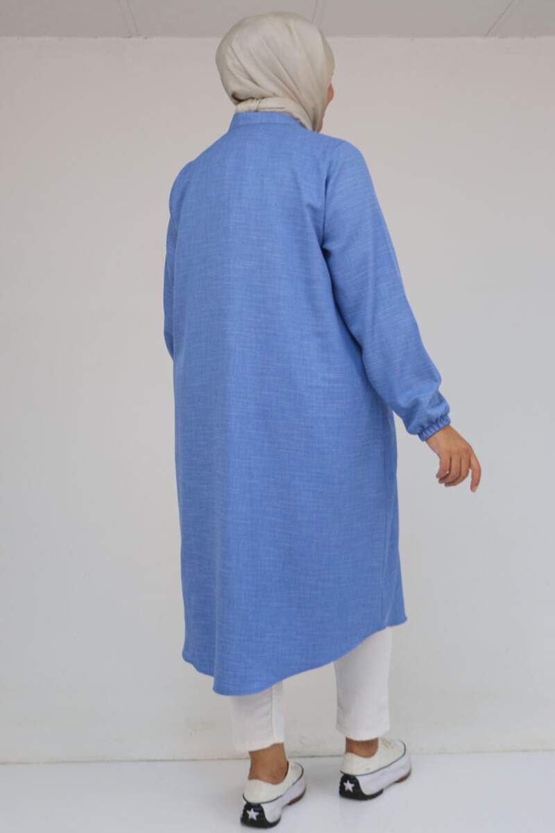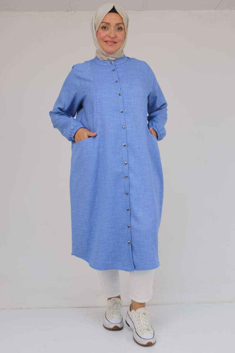 48072-1 Büyük Beden Kolları Lastikli Tunik - İndigo Kırçıllı