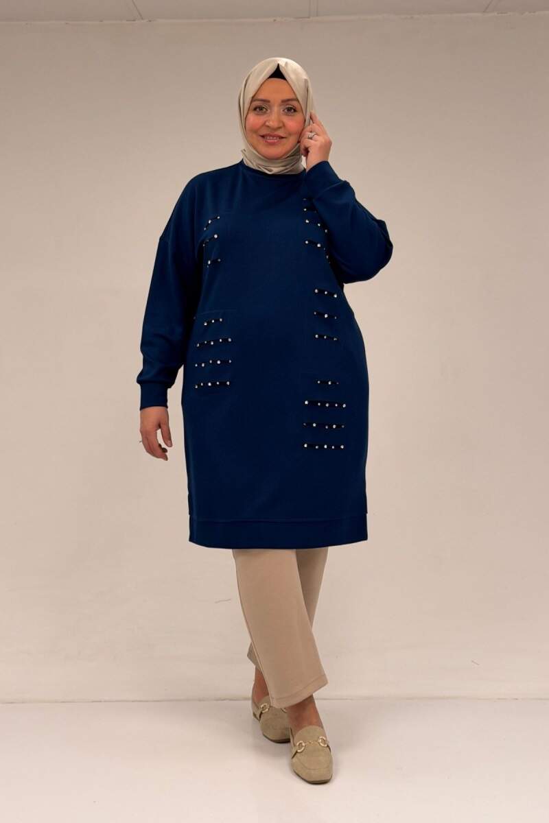 48089 Büyük Beden Beyoğlu Taşlı Modal Tunik - İndigo