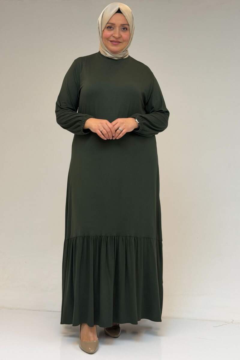 52034 Büyük Beden Eteği Fırfrılı Penye Elbise - Haki