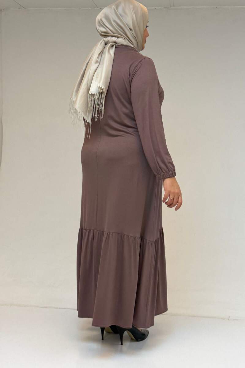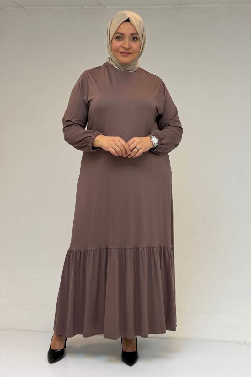 52034 Büyük Beden Eteği Fırfrılı Penye Elbise - Vizon