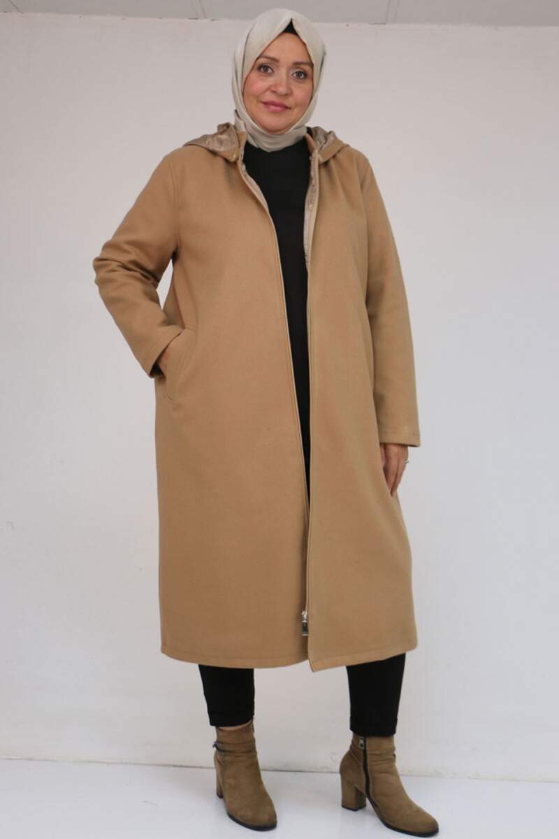 53033 Büyük Beden Kapşonlu Boydan Fermuarlı Kaşe Kaban - Taba