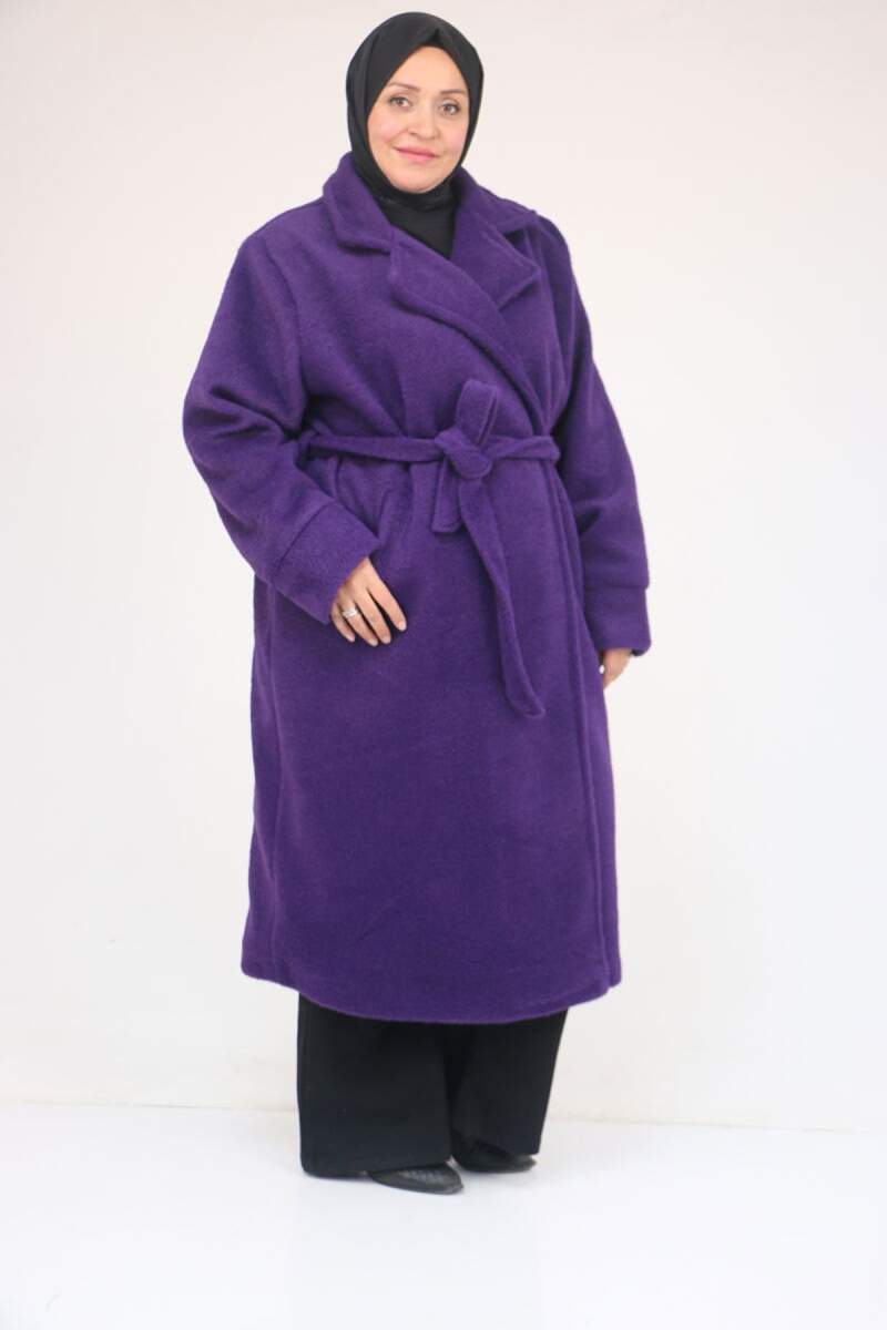 53049 Büyük Beden Keçe Kalın Manşetli Kaban - Mor