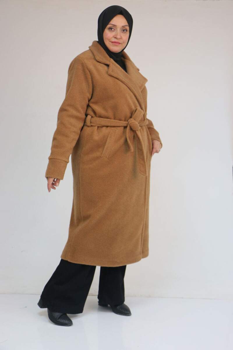 53049 Büyük Beden Keçe Kalın Manşetli Kaban - Taba