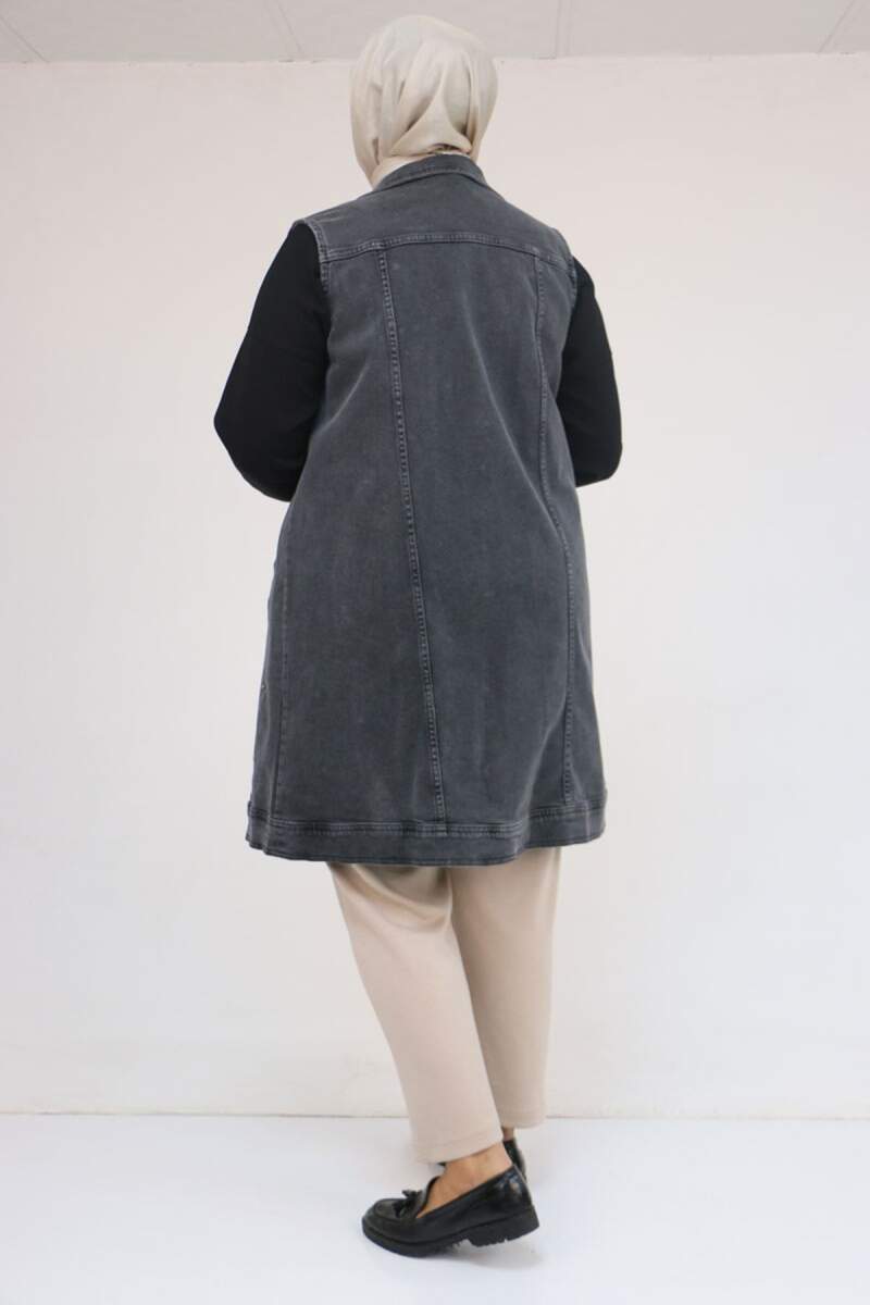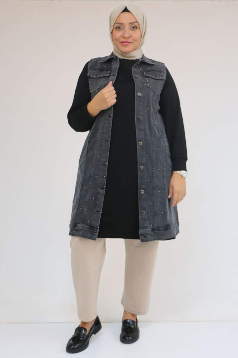 54007 Büyük Beden Çift Cepli İnci Çakmalı Kot Yelek - Kar Ykama Siyah