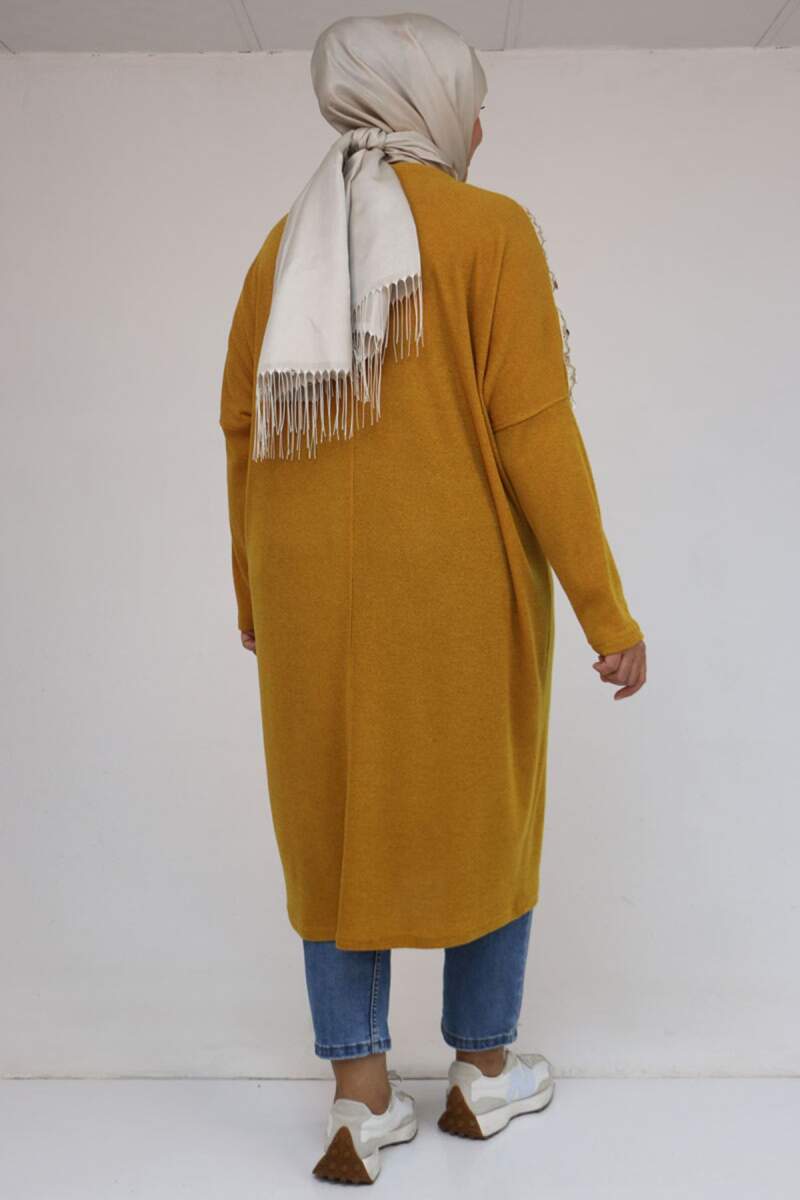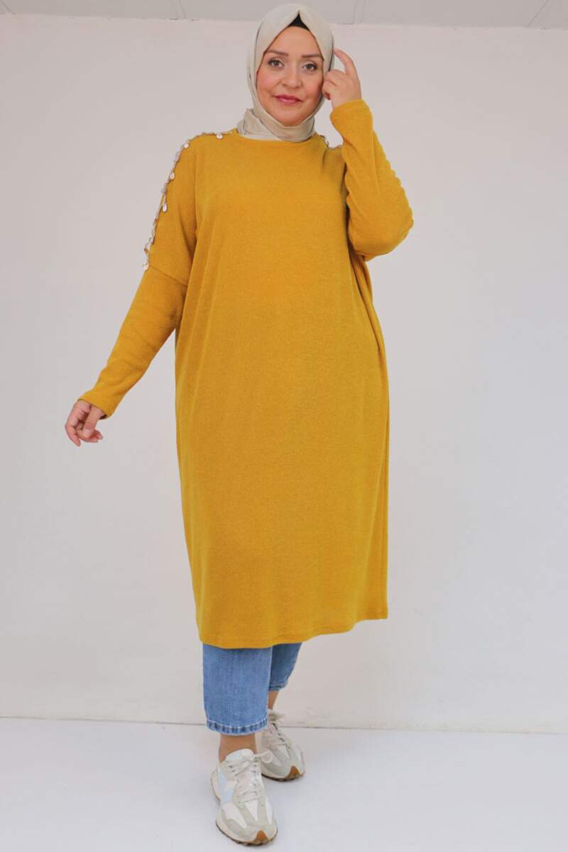 58112 Büyük Beden Omzu Aksesuar Detaylı Düşük Kol Tunik - Hardal