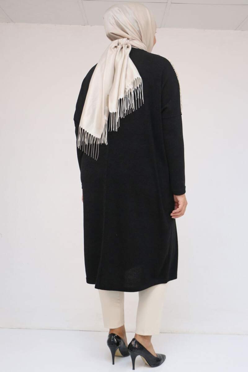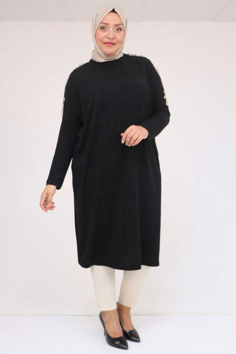 58112 Büyük Beden Omzu Aksesuar Detaylı Düşük Kol Tunik - Siyah
