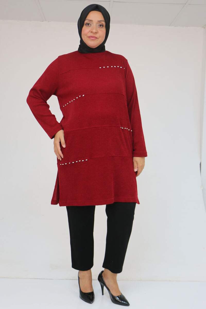 58113 Büyük Beden Dikme Taş Detaylı Çımalı Mir Tunik - Bordo