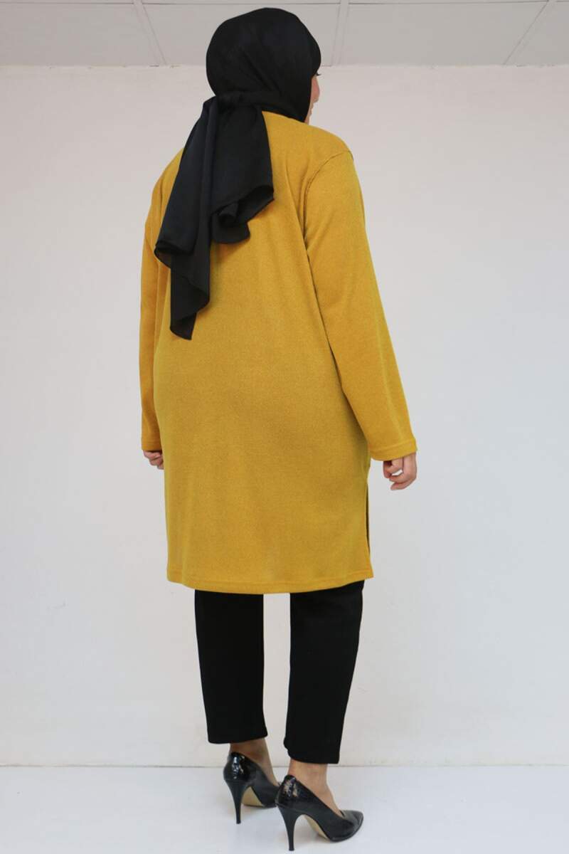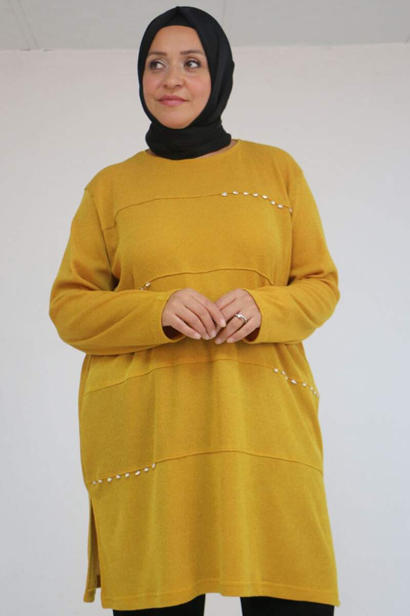 58113 Büyük Beden Dikme Taş Detaylı Çımalı Mir Tunik - Hardal