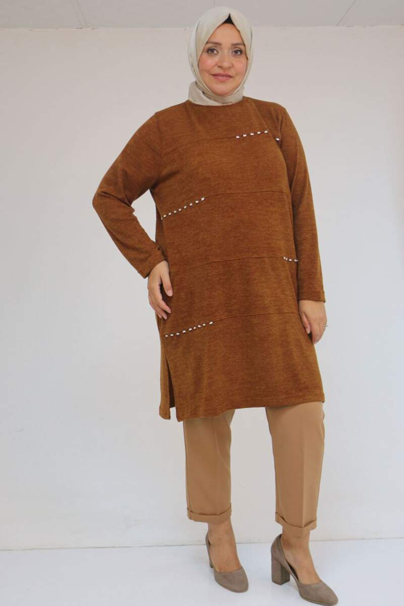 58113 Büyük Beden Dikme Taş Detaylı Çımalı Mir Tunik - Taba