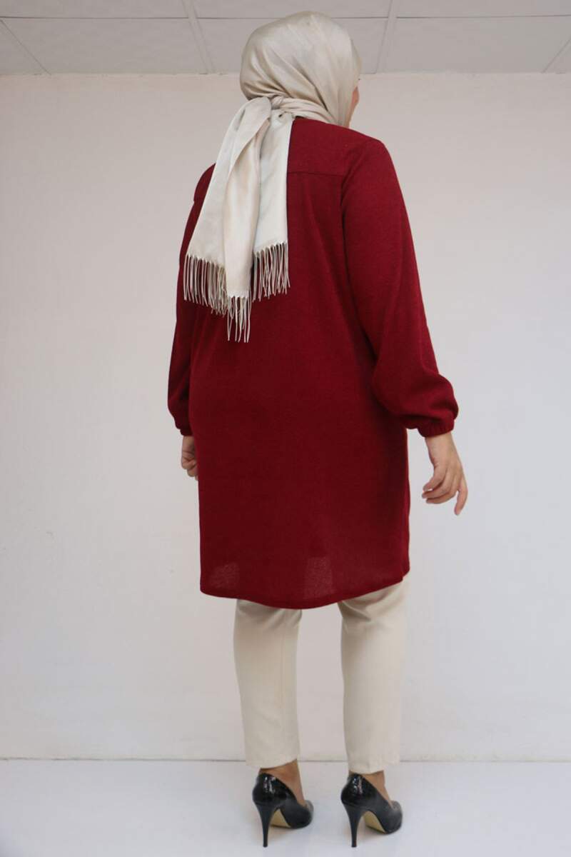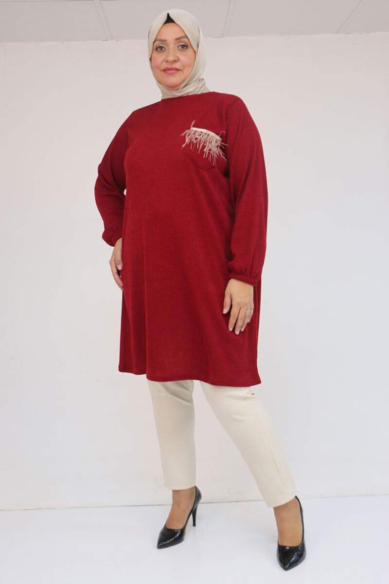 58114 Büyük Beden Kolları Lastikli Cebi Püskül Detaylı Mir Tunik - Bordo