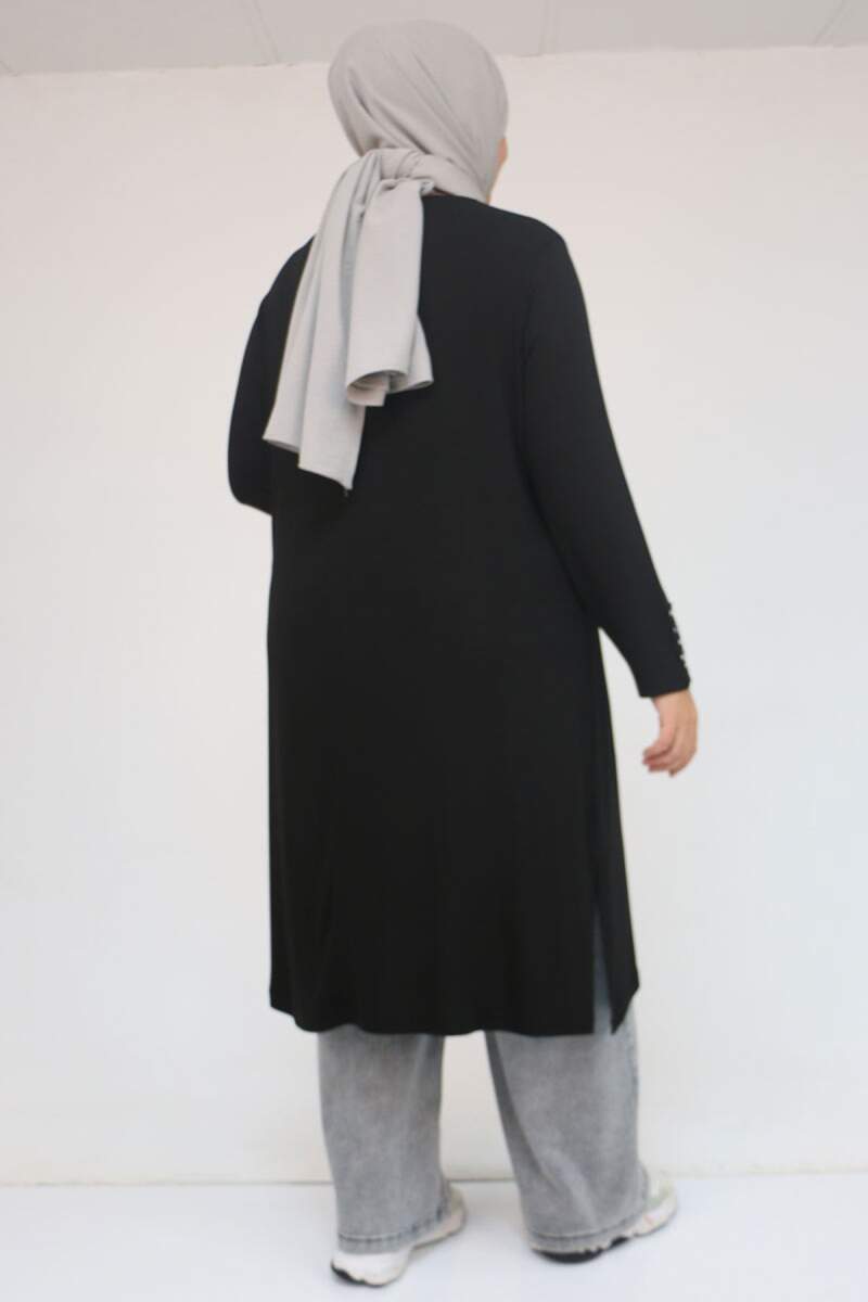 58115 Büyük Beden Kolunda Beyoğlu Detaylı Çilek Tunik - Siyah