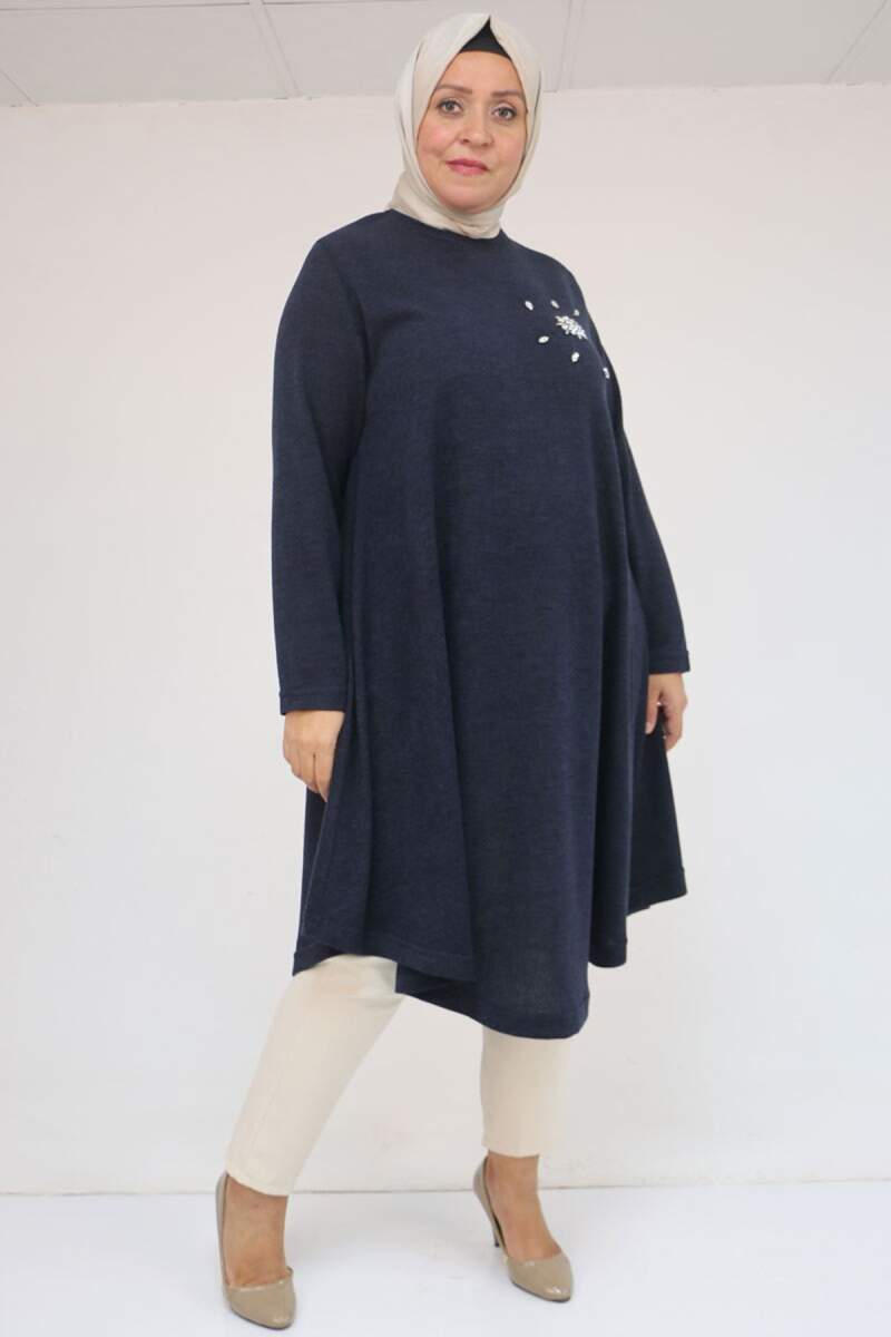 58117 Büyük Beden Taş Detaylı Mevlana Mir Tunik - Lacivert