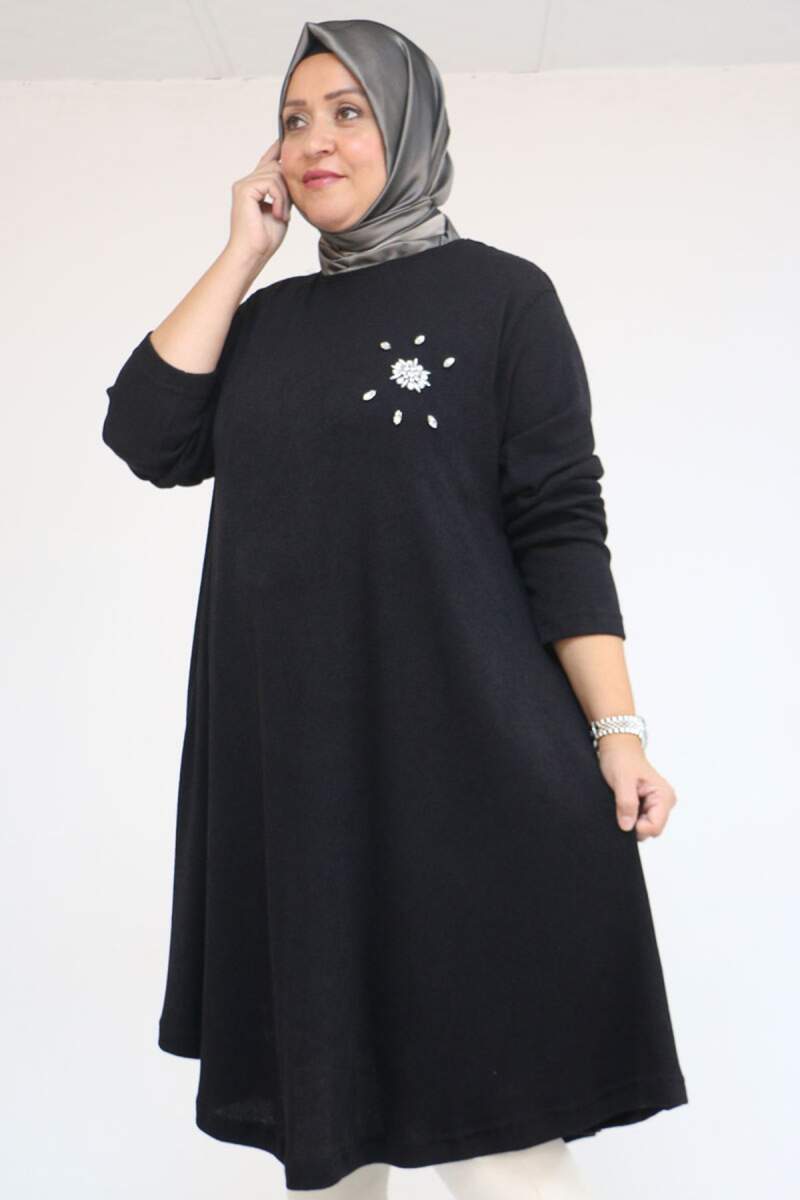 58117 Büyük Beden Taş Detaylı Mevlana Mir Tunik - Siyah