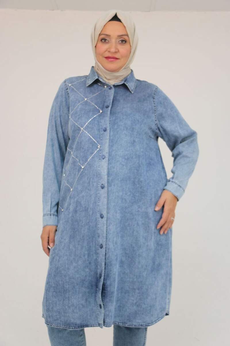 58123 Büyük Beden Önü Taş Detaylı Kot Düğmeli Tunik - Lacivert