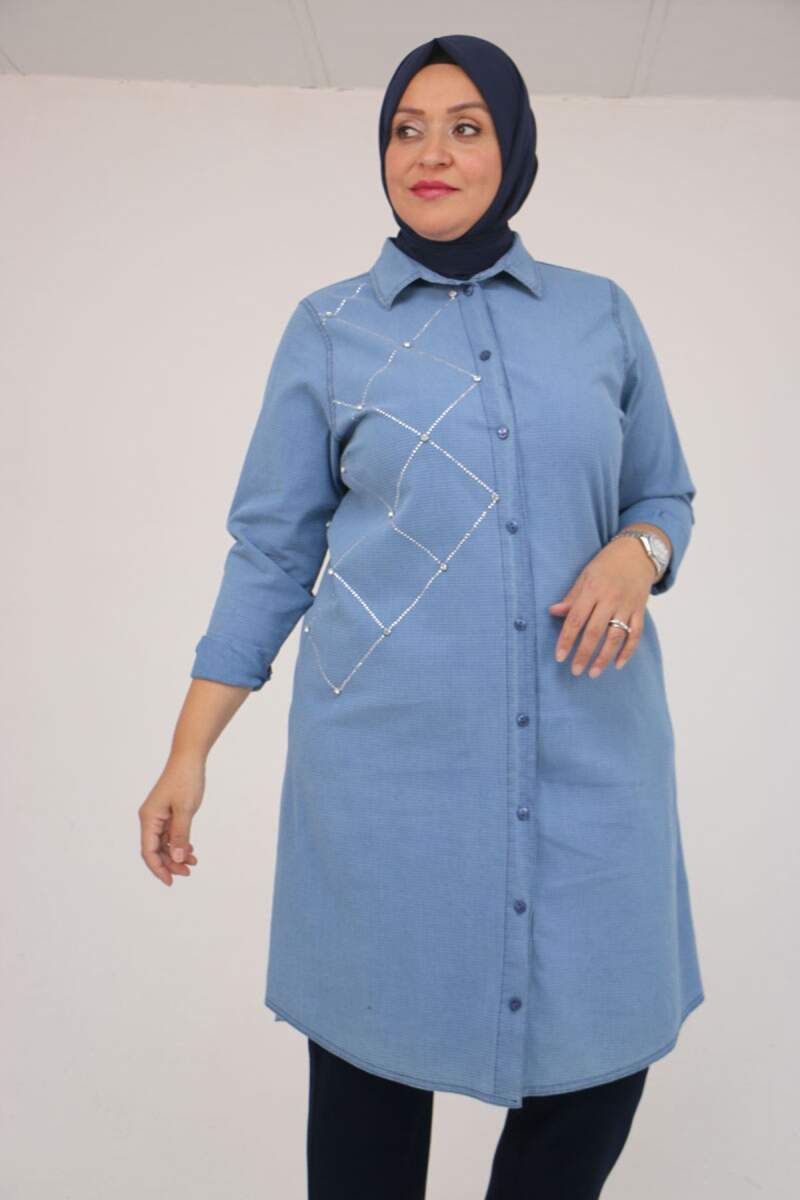 58123 Büyük Beden Önü Taş Detaylı Kot Düğmeli Tunik - Petekli