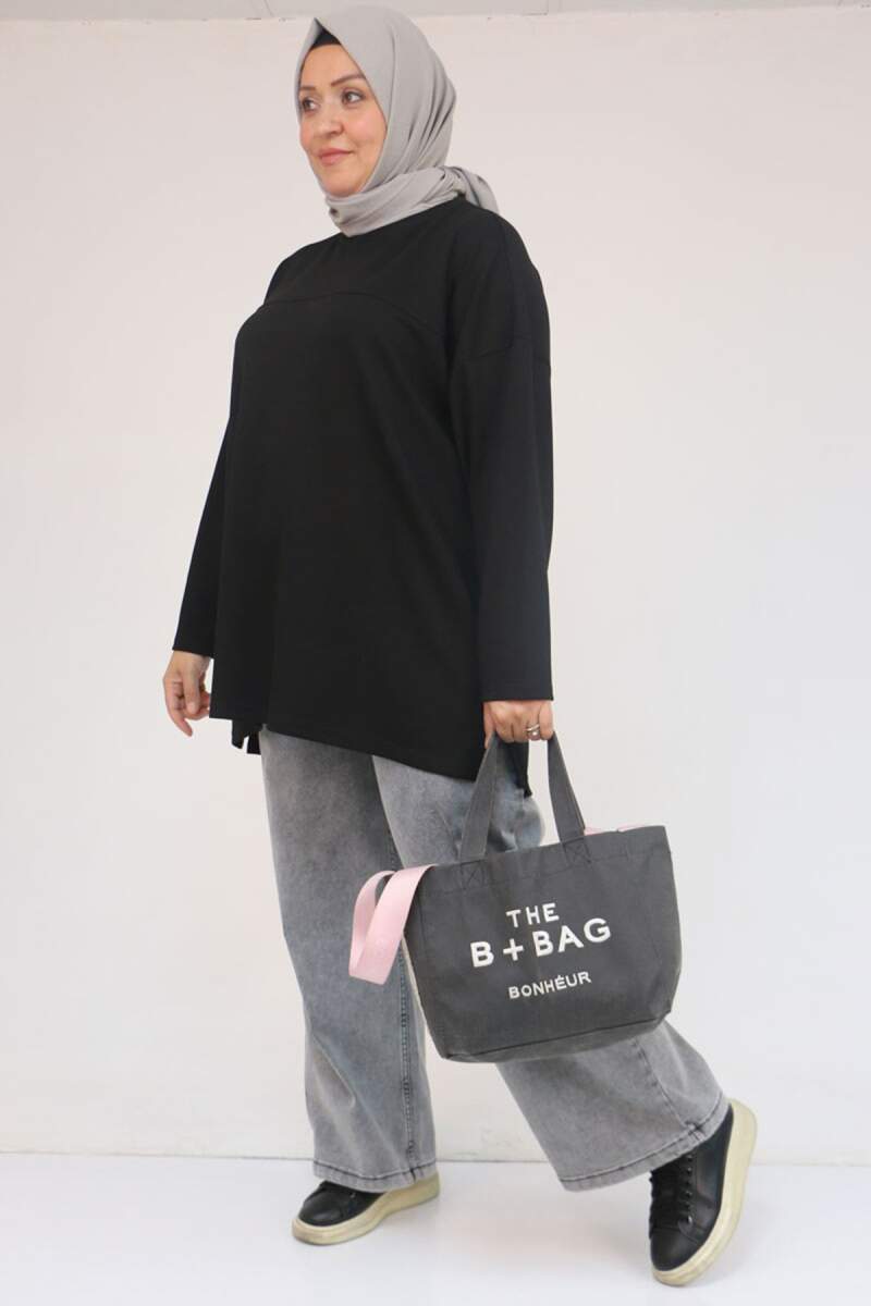 58132 Büyük Beden Önü Çıma Detaylı Yanı Yırtmaçlı Modal Tunik - Siyah