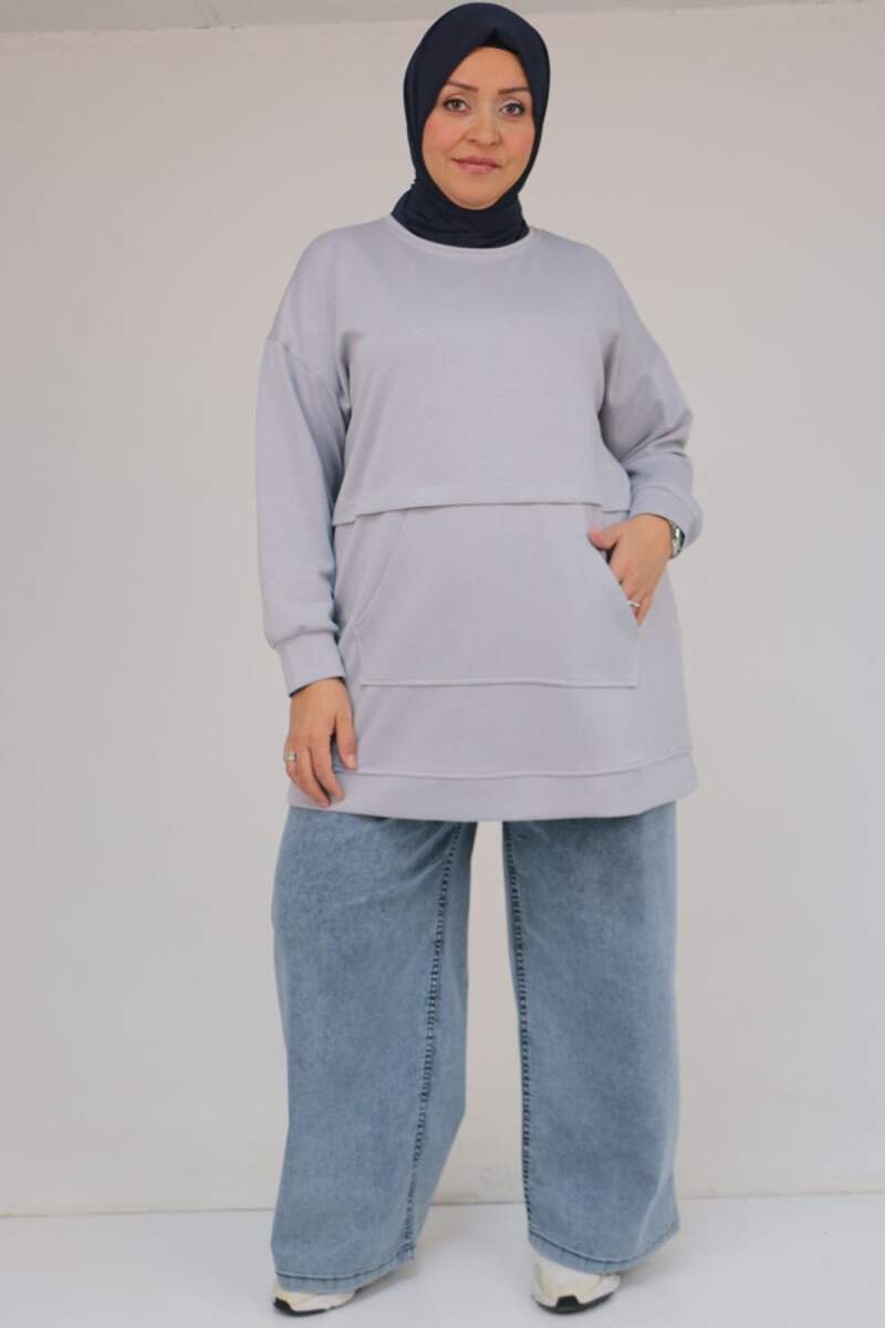 58133 Büyük Beden Kanguru Cepli Modal Tunik - Gri