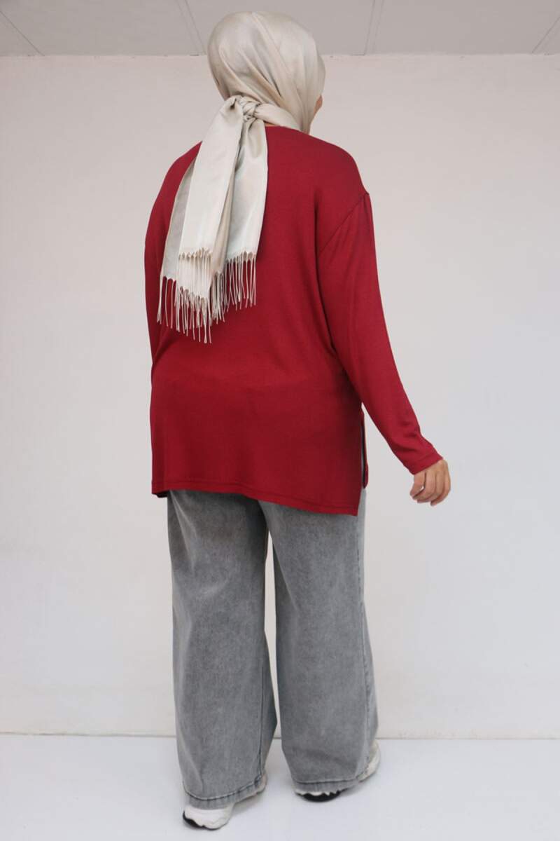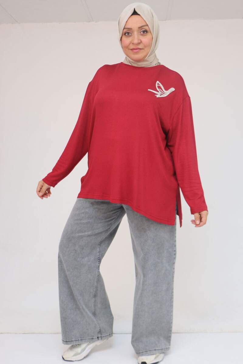 58149 Büyük Beden Taş Baskı Detaylı Çilek Tunik - Bordo