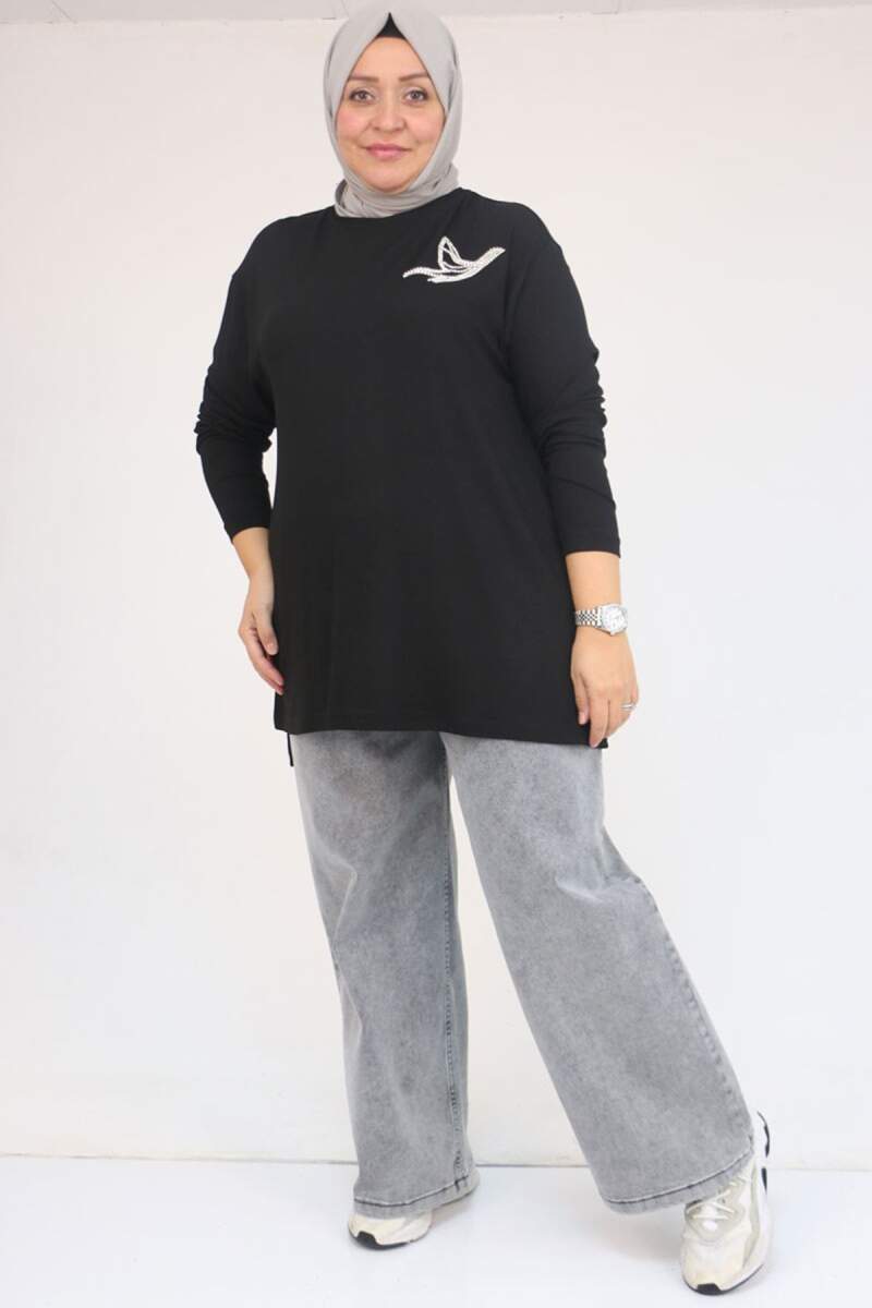 58149 Büyük Beden Taş Baskı Detaylı Çilek Tunik - Siyah