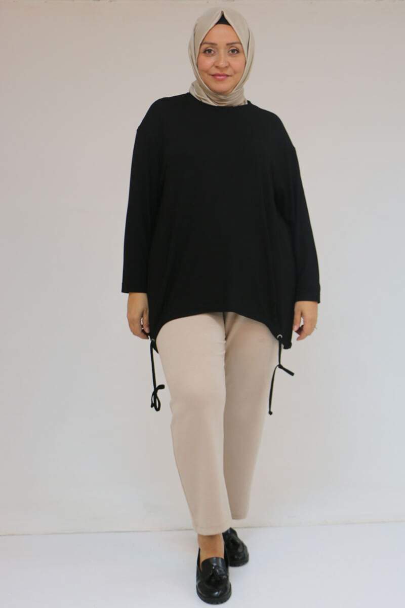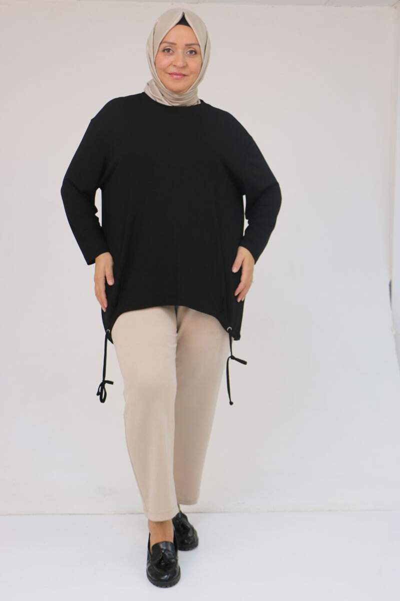 58150 Büyük Beden Kuş Gözü Bağlama Detaylı Mir Tunik - Siyah