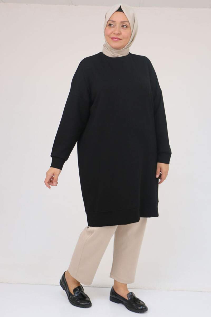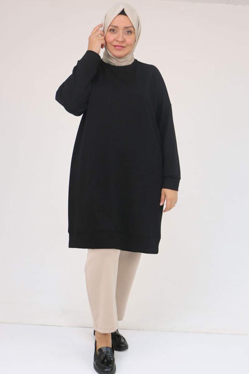 58151 Büyük Beden Kol Ve Etek Ucu Kendinden Ribanalı Modal Tunik - Siyah