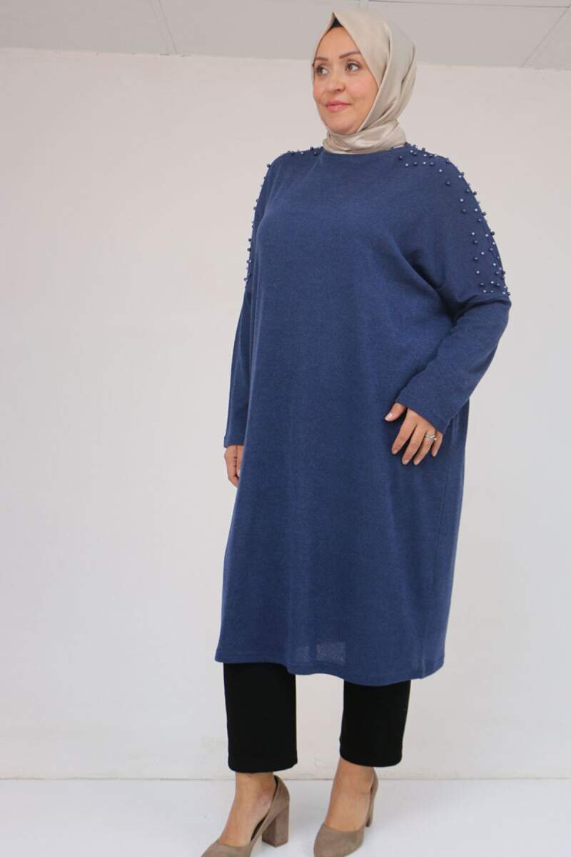 58152 Büyük Beden Düşükkol Omzu Taş Detaylı Mir Tunik - İndigo
