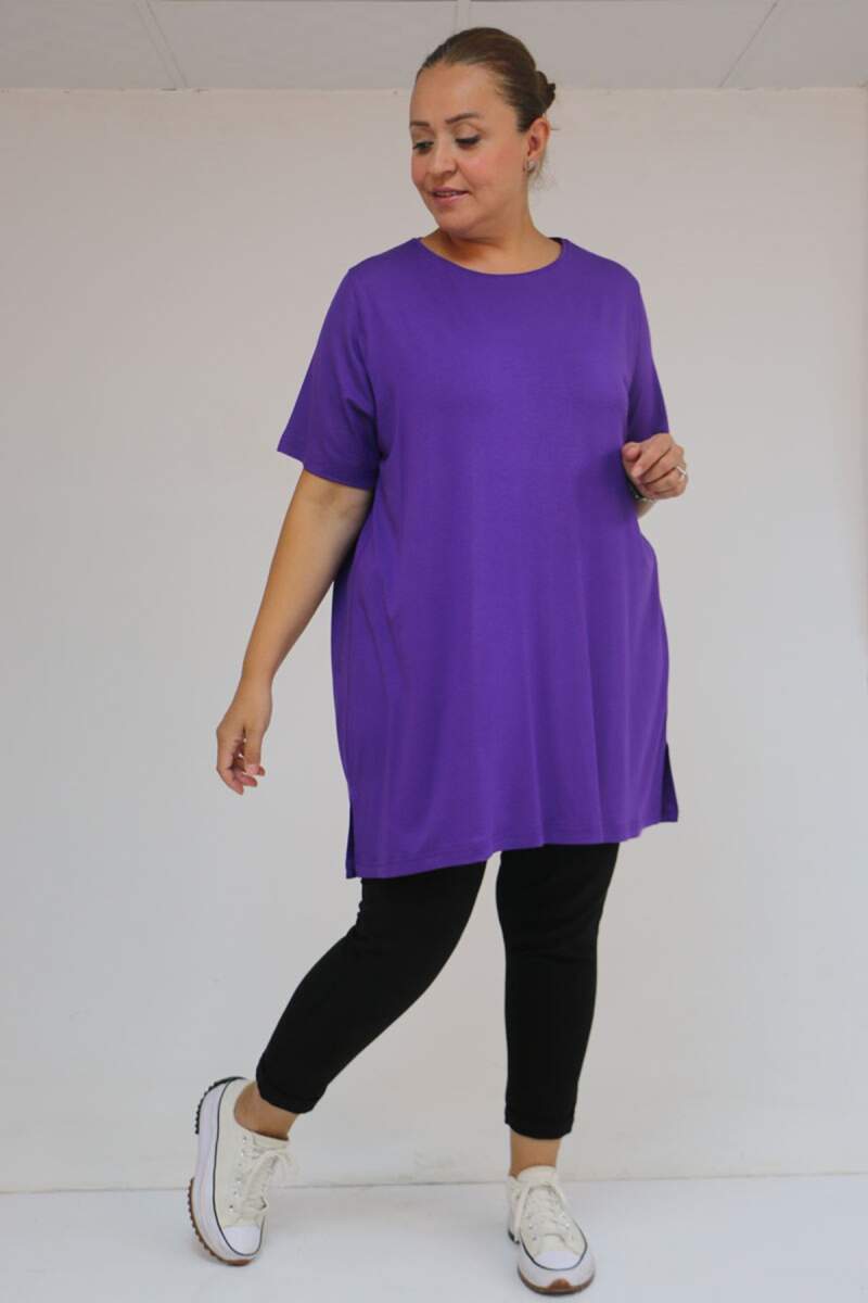 58507 Büyük Beden Yakası Biyeli Penye Tişört - Lila