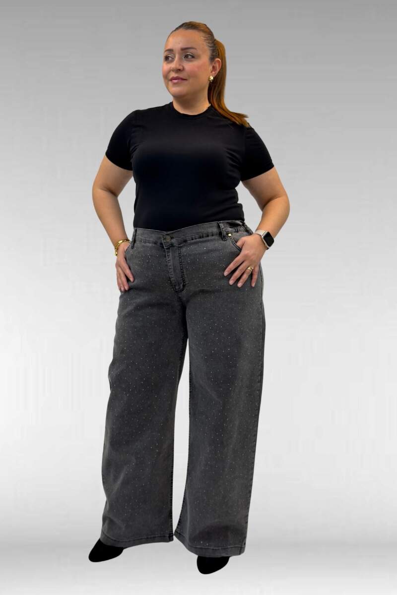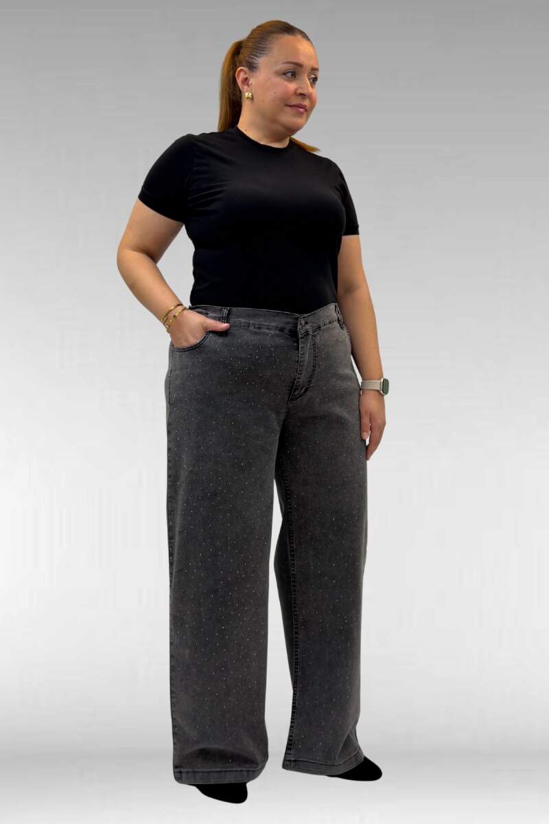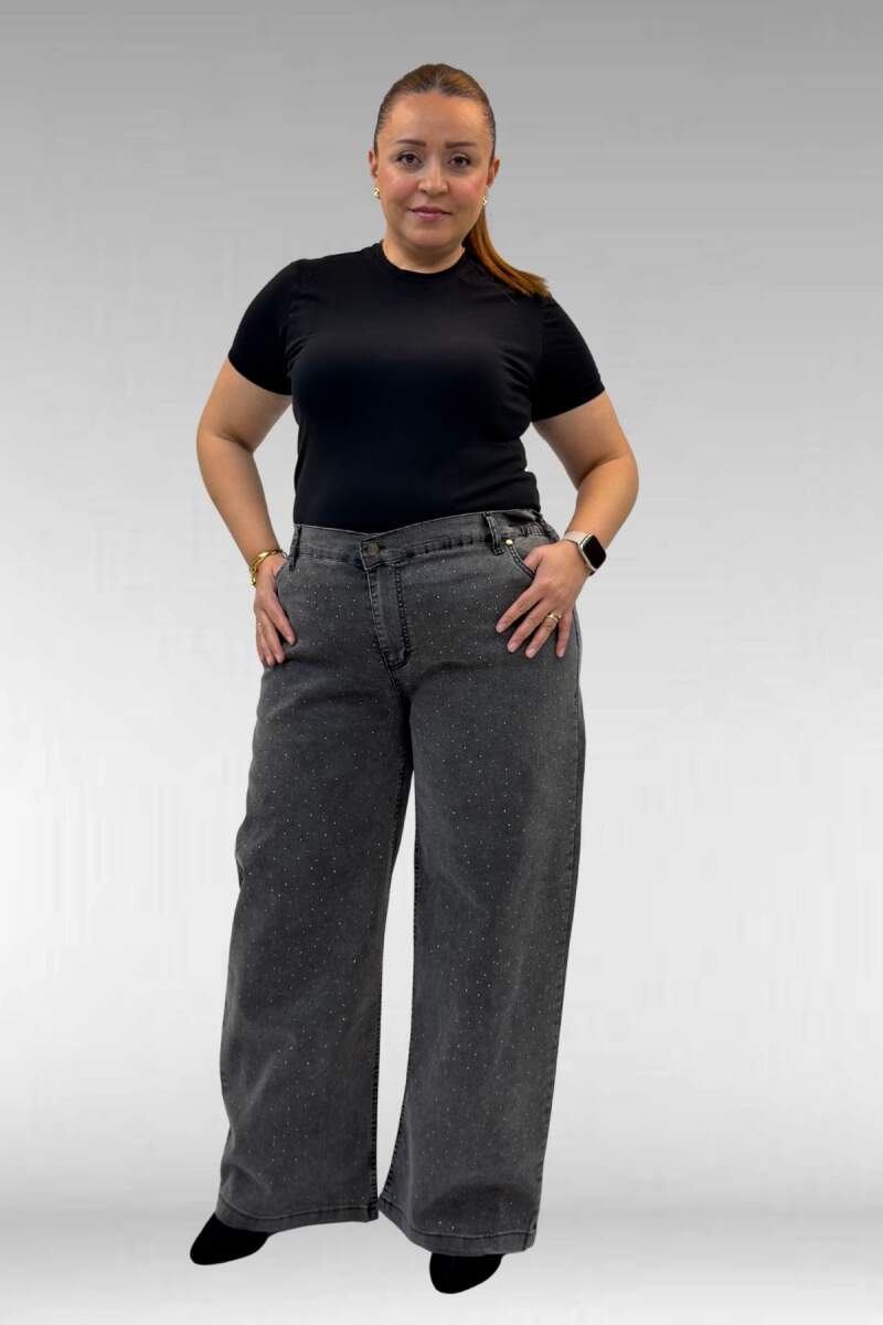 59037 Büyük Beden Önü Taşlı Bol Paça Kot Pantolon - Antrasit
