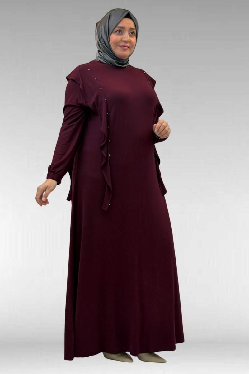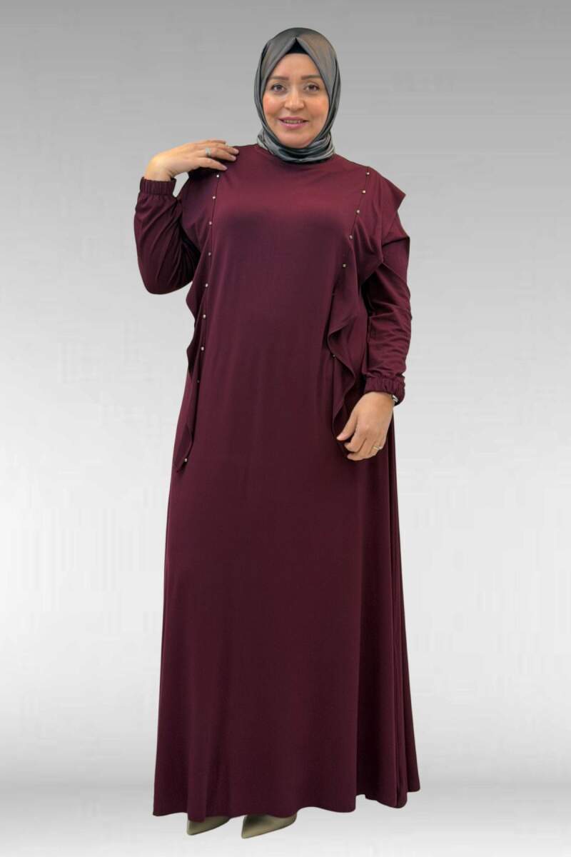 62003 Büyük Beden Omuzdan Aşağı Fırfır Detaylı Penye Elbise - Bordo