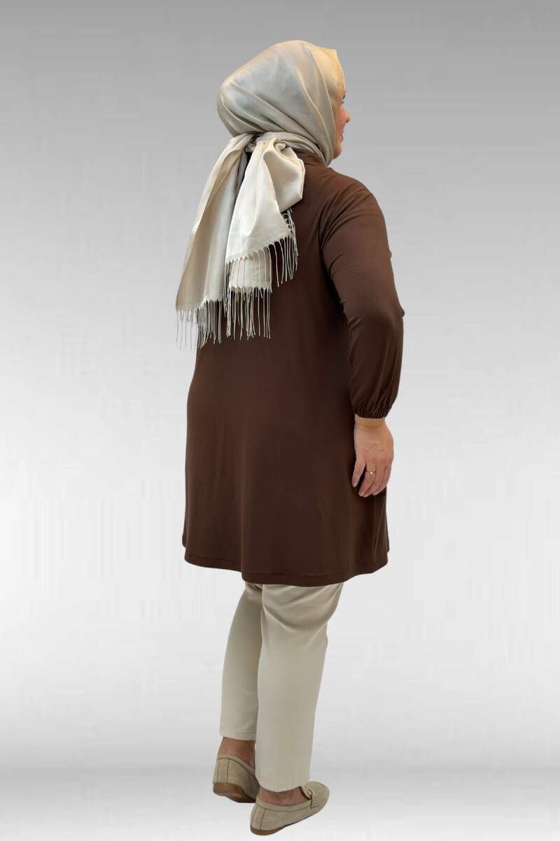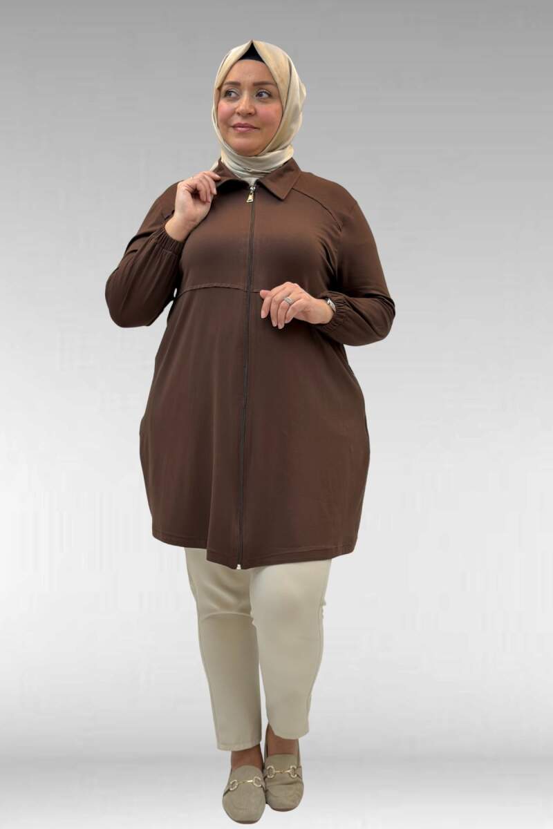 63002 Büyük Beden Fermuarlı - Kapüşonlu Penye Ceket - Kahve