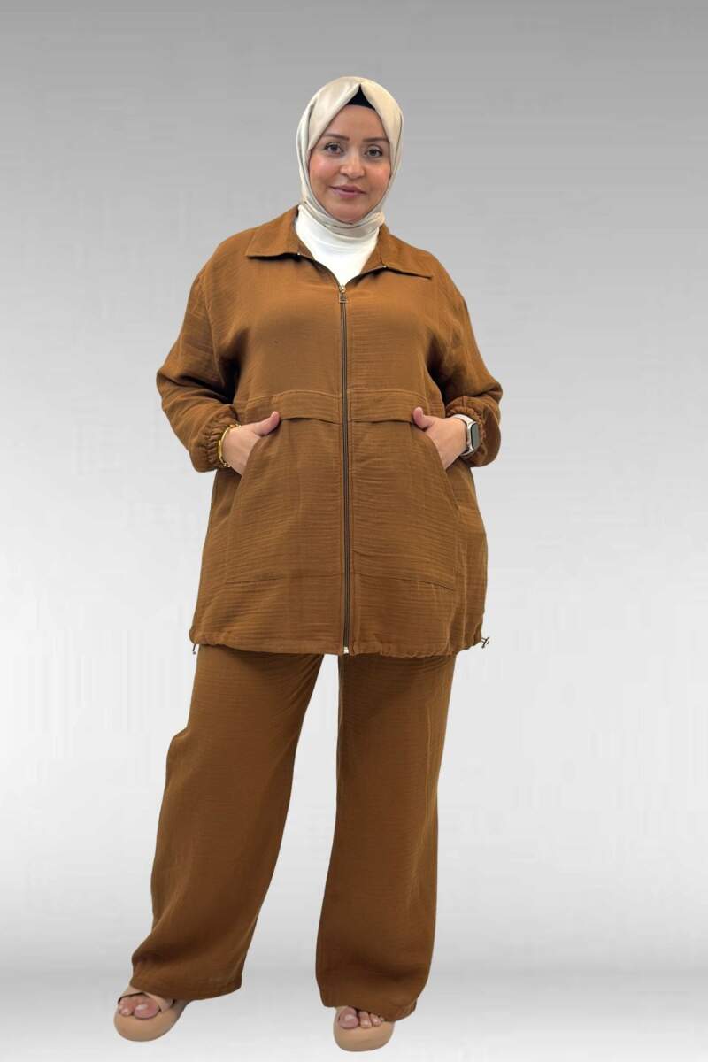 67016 Büyük Beden Kol Ve Etek Ucu Lastik Detaylı Müslin Pantolonlu Takım - Kahve
