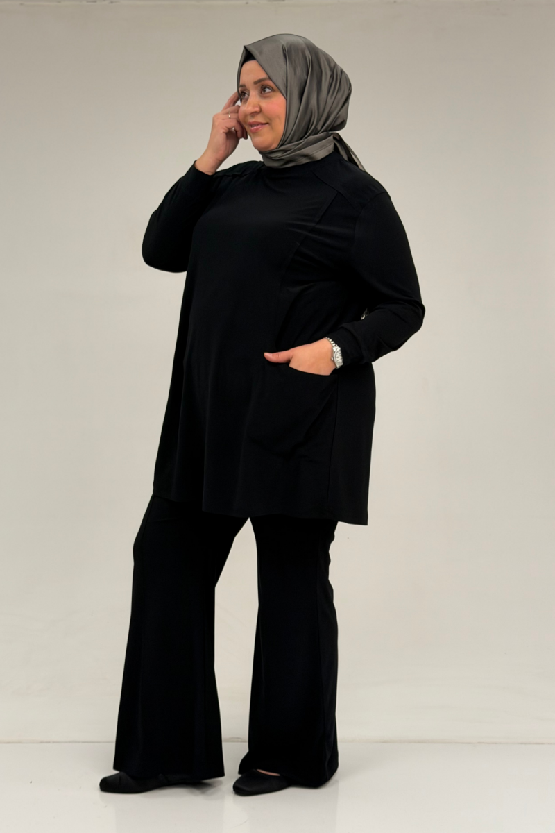 67031 Büyük Beden Yanları Cep Detaylı Pantolonlu Sandy Takım - Siyah