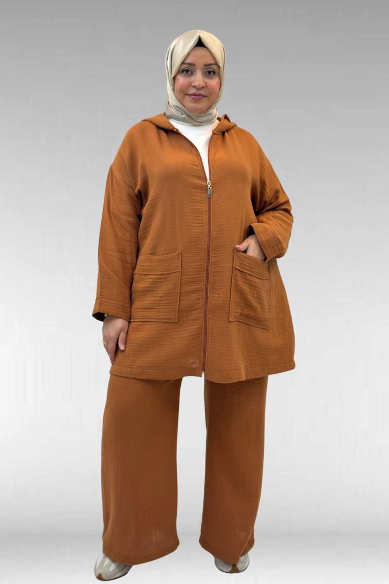 67035 Büyük Beden Kapşonlu Fermuarlı Müslin Pantolonlu Takım - Tarçın