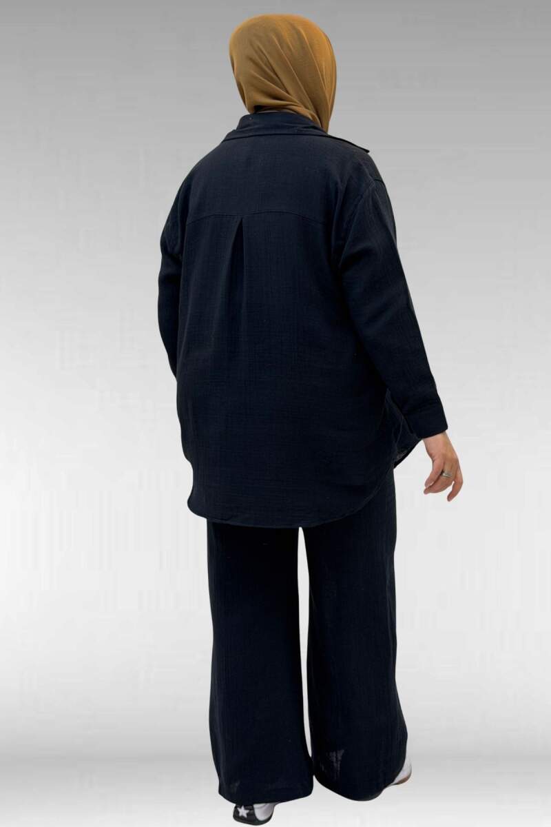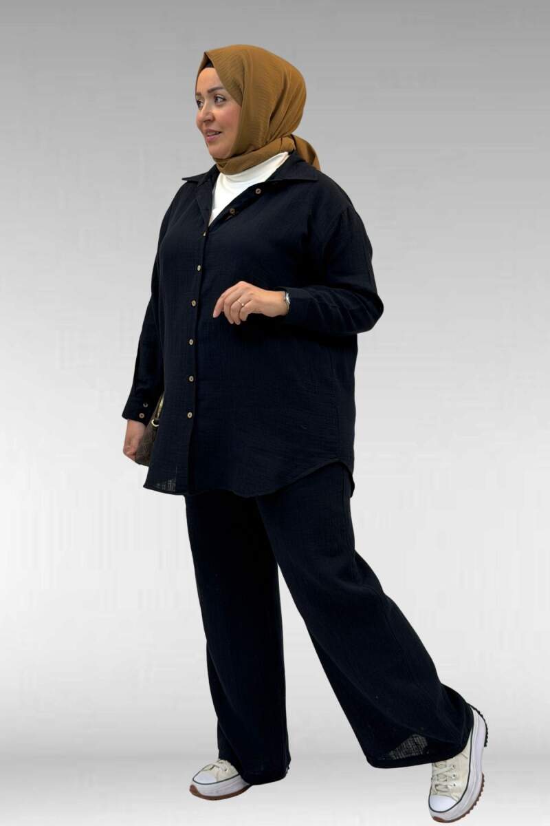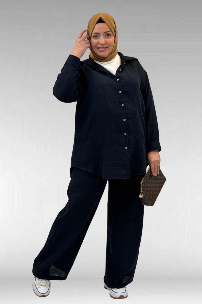 67038 Büyük Beden Erkek Yakalı Müslin Pantolonlu Takım - Siyah