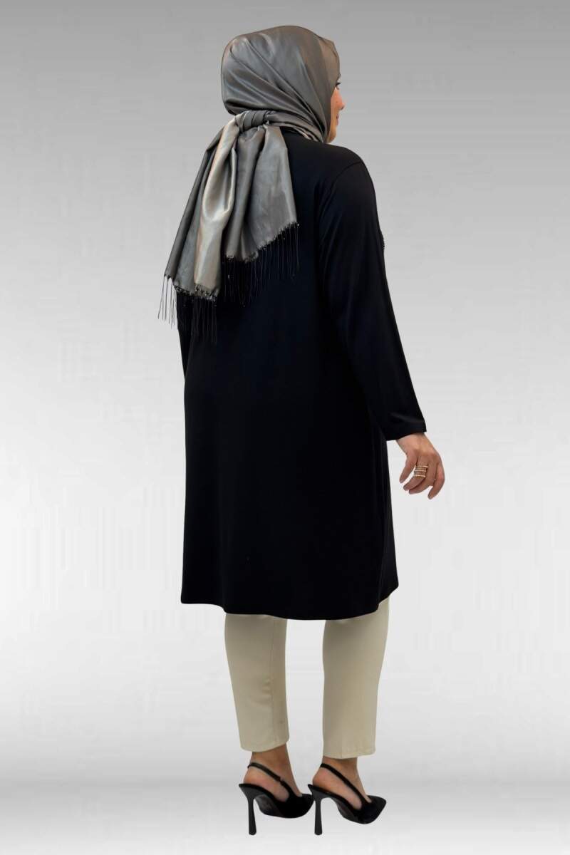 68002 Büyük Beden Önü Güneş Parıltılı Taş Baskılı Penye Tunik - Siyah