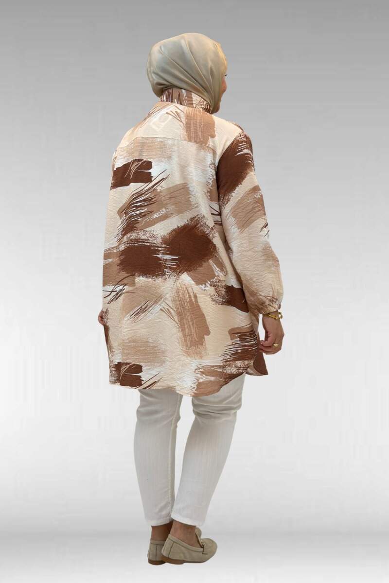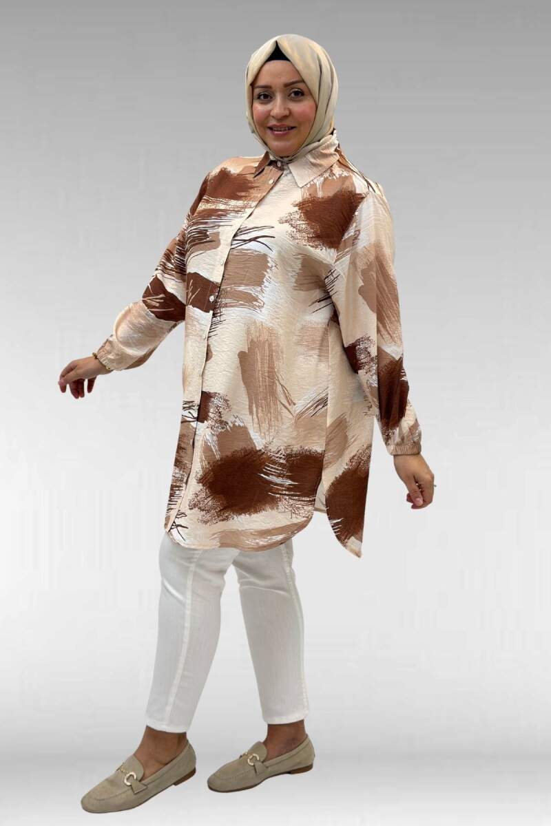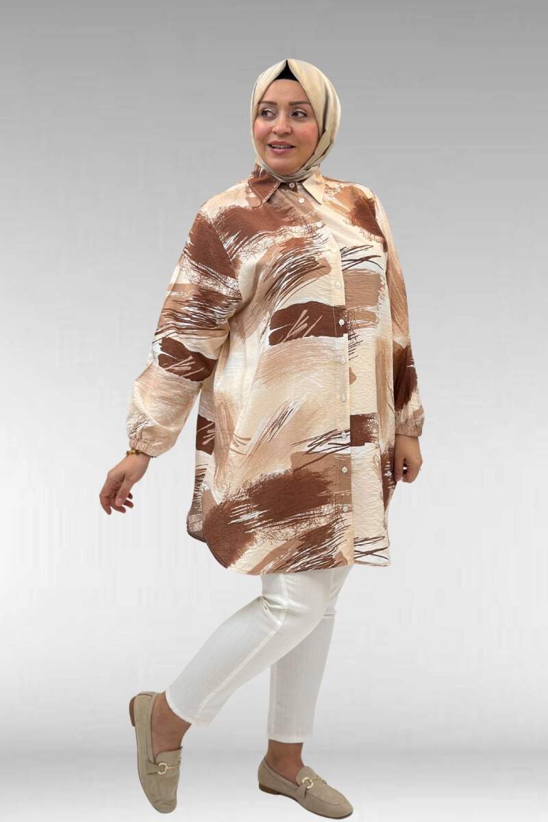 68010 Büyük Beden Yanları Yırtmaçlı Kolları Lastikli Mango Tunik - Desenli Çikolata Kahve
